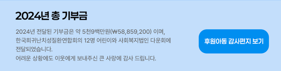 2024년 총 기부금 -2024년 전달된 기부금은 약 5천9백만원 (\58,859,200)원 이며,  이 금액은 한국희귀난치성질환연합회가후원하는 12명의 어린이와 사회복지법인 다운회에 전달되었습니다. 어려운 상황에도 이웃에게 보내주신 큰 사랑에 감사 드립니다.